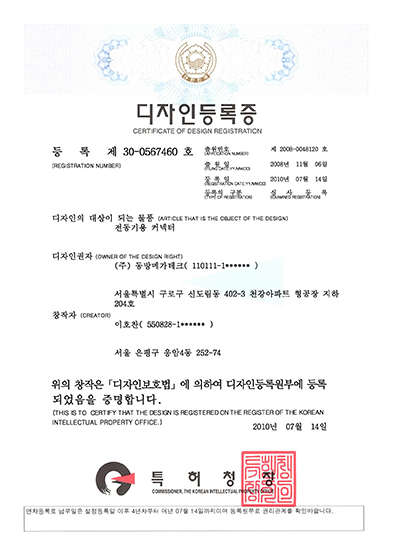 전동기용 커넥터의 디자인등록증