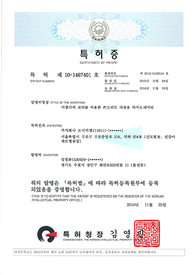 타설용 바이브레이터의 특허증