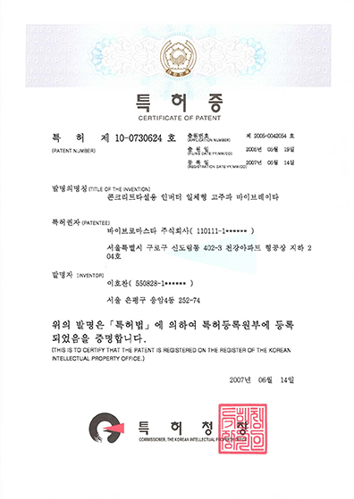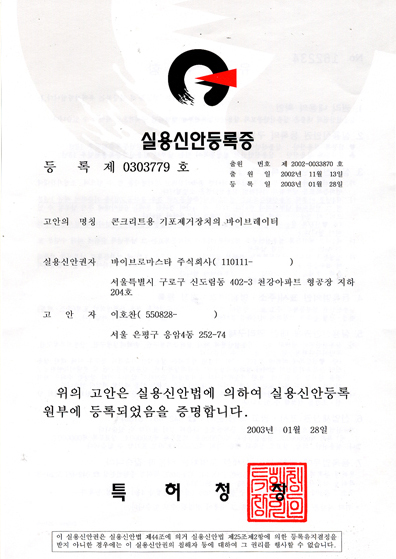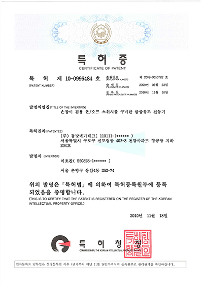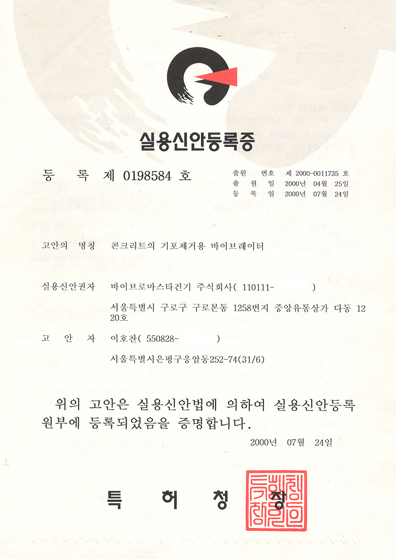 일체형 고주파 바이브레이터의 특허증