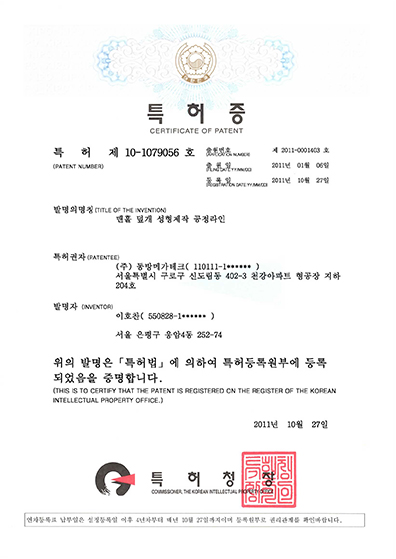 맨홀 덮개 성형제작 공정라인의 특허증